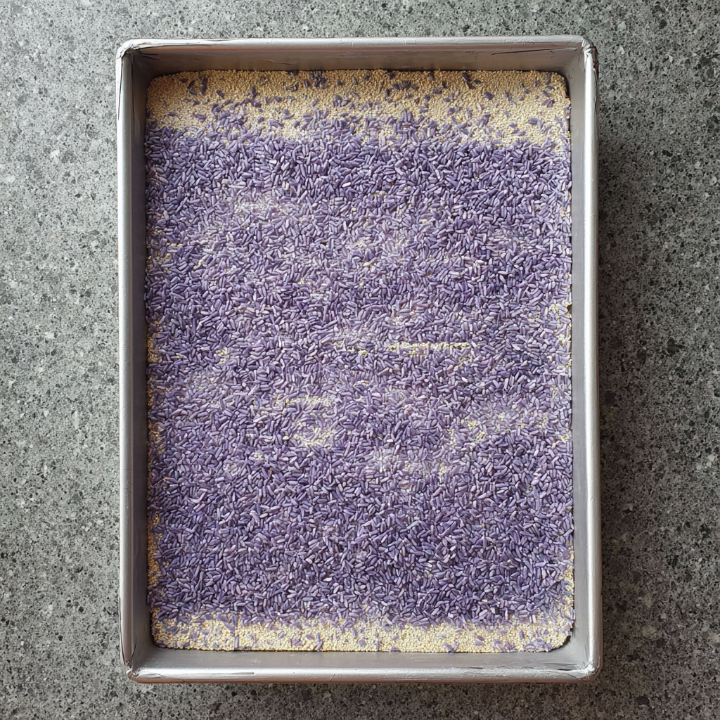 Whip double cream with icing sugar and ube extract until soft peaks form. Spread over the soaked cake evenly and sprinkle toasted coconut on top if desired. Refrigerate for at least 4 hours, or ideally overnight, before serving.